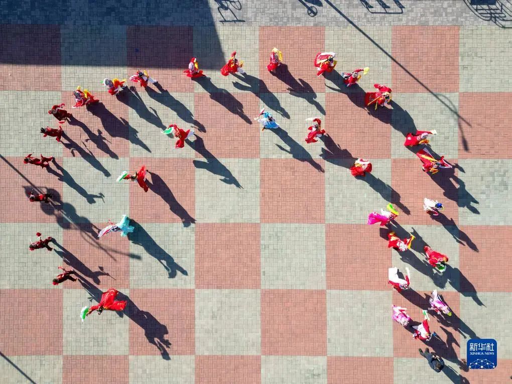 河北省滦州市葛庄村地秧歌队队员在村广场上表演(11月17日摄,无人机照片)。