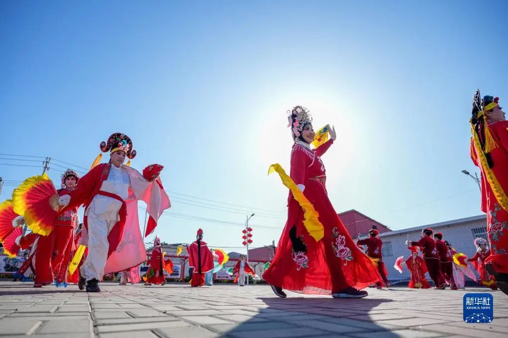 河北省滦州市葛庄村地秧歌队队员在村广场上表演(11月17日摄)。