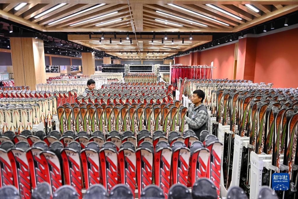 12月8日,玉龙湾滑雪场的工作人员在整理滑雪板。