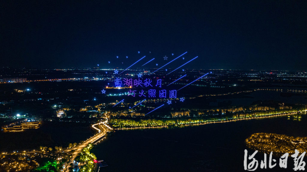 图为中秋假期,唐山南湖上空无人机表演现场。郭宝强摄
