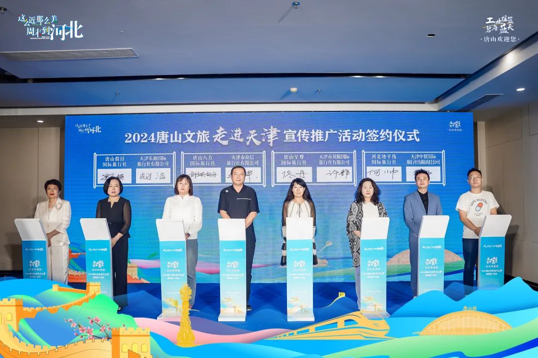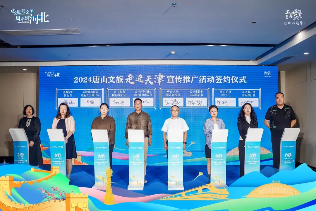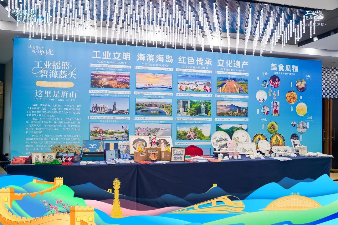 活动现场,唐山文旅推介官进行了沉浸式推介,南湖·开滦旅游景区、河头老街、曹妃甸揽月湾旅游景区、唐山国际旅游岛、迁安市长城国家文化公园、曹妃甸多玛乐园登场展示、精彩邀约。唐山市文化广电和旅游局和天津南开区文化和旅游局签署了文化旅游协同发展合作协议,两地16家旅行社签订了合作协议。活动期间还组织了乐亭大鼓非遗表演和唐山文创成果展,唐山陶瓷、唐山宴美食(文创)、玉田泥塑、乐亭皮影、曹妃甸河豚玩偶、滦南剪纸等精美文创产品受到参会人员的称赞。